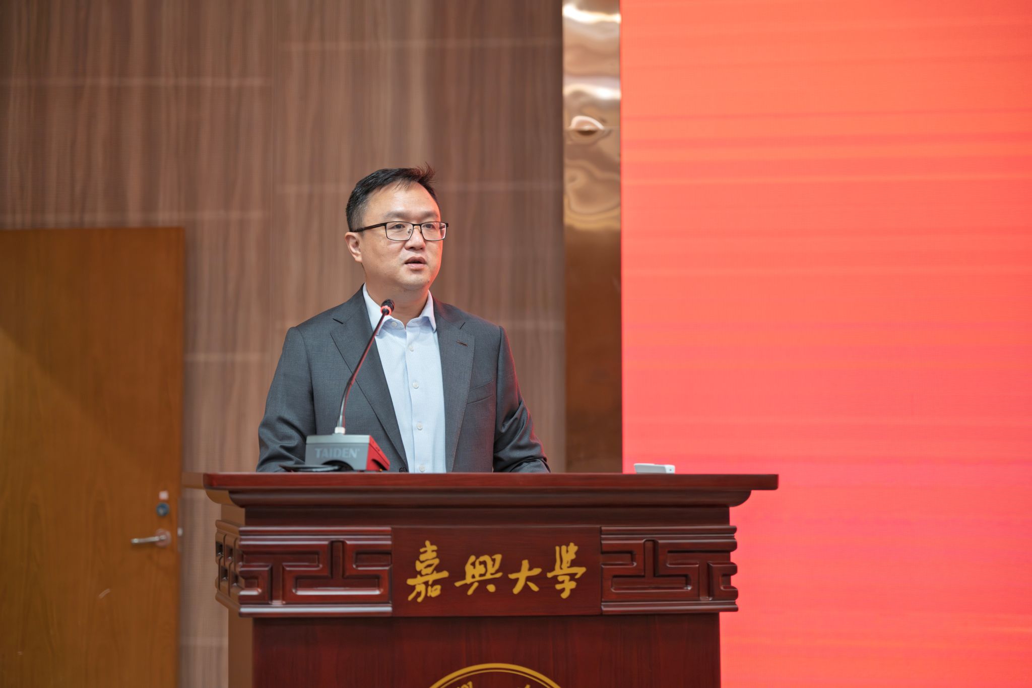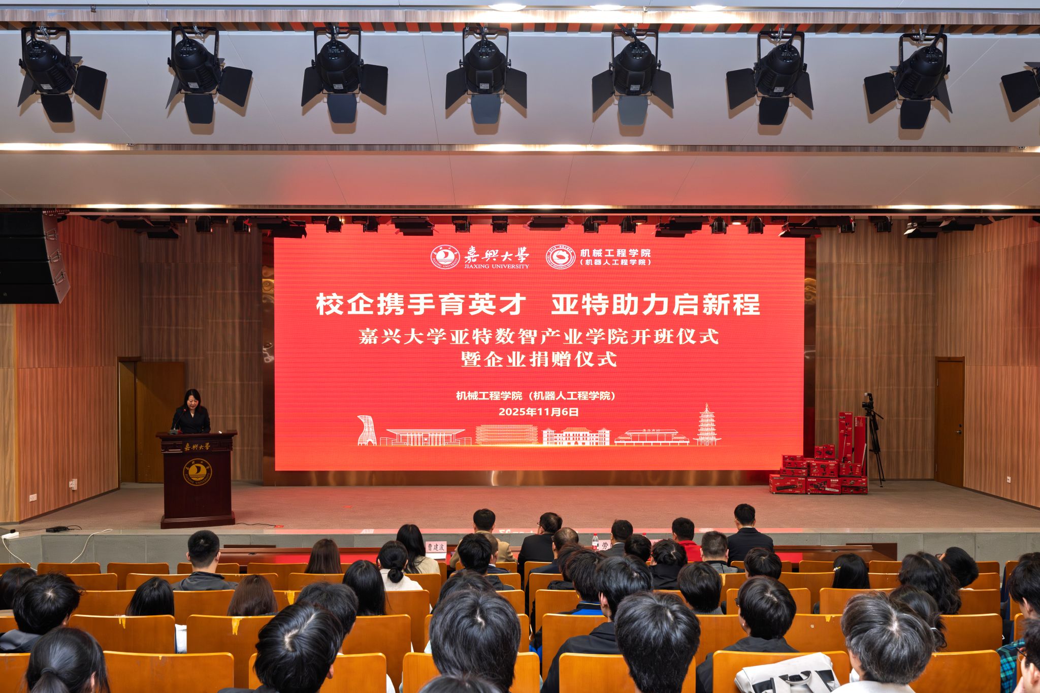 11月6日,嘉兴大学亚特数智产业学院开班仪式暨企业捐赠仪式在图书馆报告厅顺利举行。浙江亚特电器股份有限公司总经理劳崮,人事部经理栾伟,嘉兴大学机械工程学院(机器人工程学院)院长朱耀东、党委书记战昕、党委副书记李寒星,机械工程系主任曹建波、智能装备产业学院院长助理杨超及产业学院导师、产业学院全体学生等70余人齐聚现场,仪式由院党委书记战昕主持。