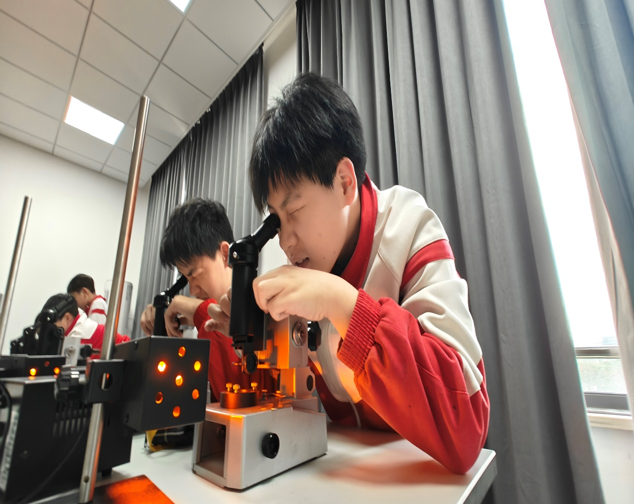活动中,祁月盈、王禹、张煜、段晓勇等党员教师团队创新采用“静电是空气中的电荷舞者”、“声音的传播像水波”等生活化比喻,将抽象物理原理转化为可感知的科学现象。学生们在潘聪、陈晨、吕令杰、杨琴、柴爱华、戈迪和赵浙明等教师及本科生志愿者的指导下,分组完成“牛顿环”和“迈克尔逊干涉实验”,亲手调试光学镜片观察彩色干涉条纹,直观理解物理原理。